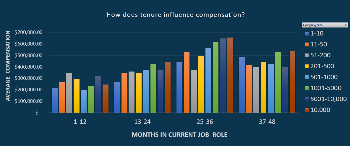 For example, the data showed that the average compensation for executives who had been in the same role for 3 or more years was 21.5% less that those executives who had been in their role for 2-3 years. This reduction in compensation was even larger (38%) within companies that employed between 5,000 – 10,000 employees.