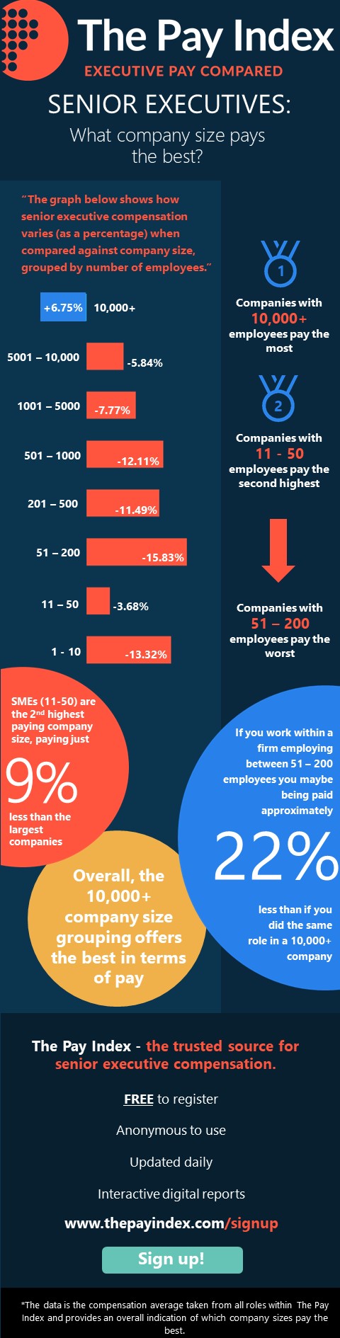 It may not surprise you that companies employing 10,000 or more employees offer the highest levels of executive pay, according to the latest data from The Pay Index, launched in February 2018, and already being used by thousands of global senior executives to benchmark their compensation.