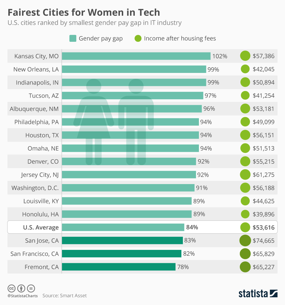(Extract) If you are a woman and want to work in a fair environment within the tech industry you best move to Kansas City. Well, the City of Fountains does not have a big reputation as an innovative tech hub in the U.S. but at least it has the smallest gender pay gap. To be exact, women are even paid two percent more than men in Missouri’s largest city’s tech industry.