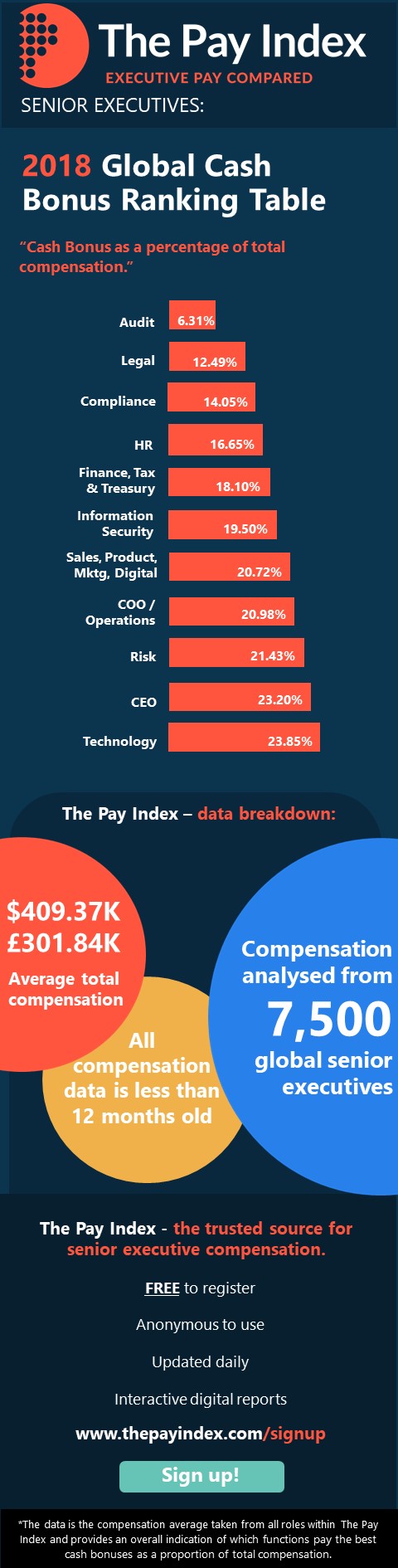 The average cash bonus across the entire database of executives, spanning all functions, regions and roles, stands at 20.10% (with base salary being 63.45% and deferred cash / stock making up the remaining 16.45%).